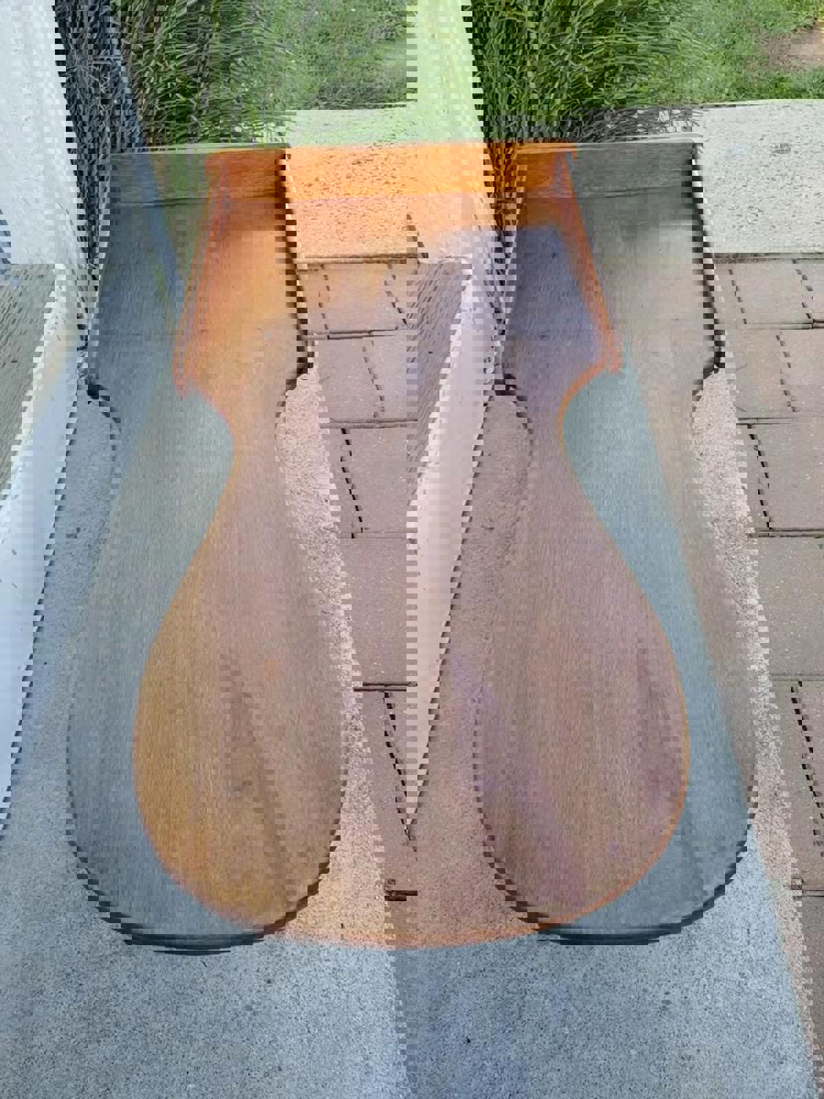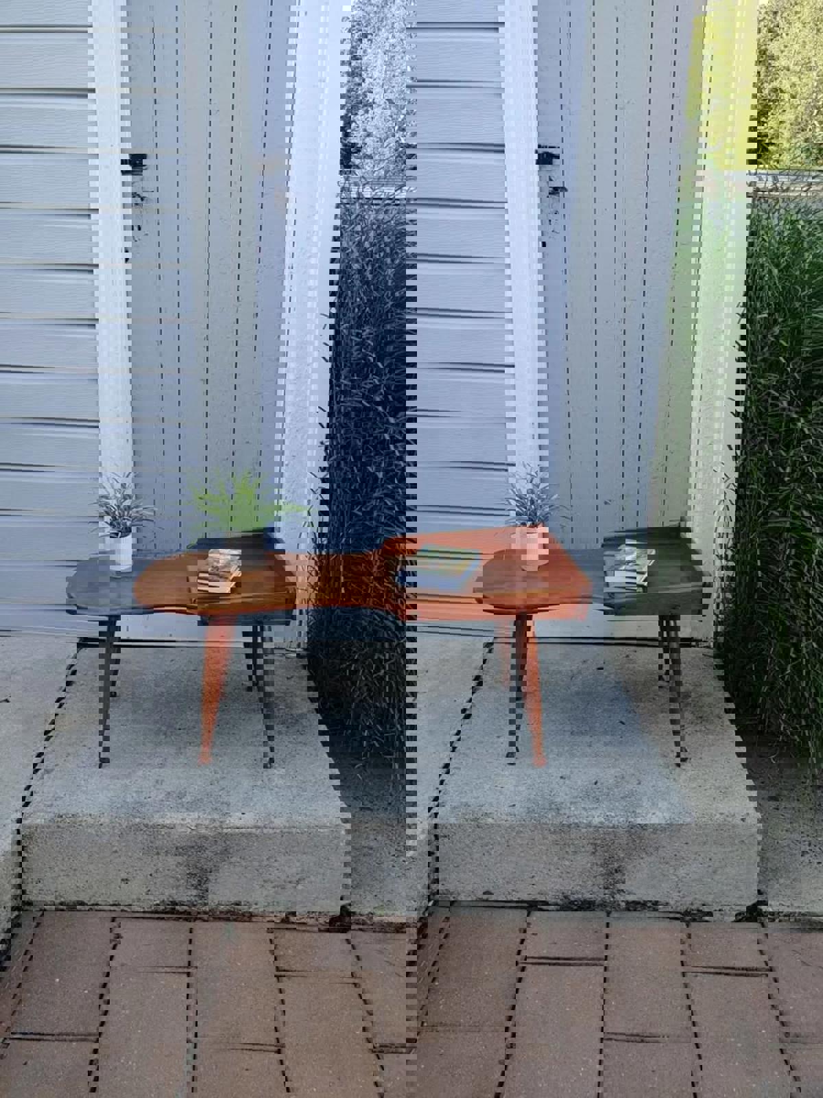 Mid-Century Asymmetrical Solid Wood Coffee Table with Raised Back Lip This sculptural table is emblematic of mid-century American design. The smooth and flowing design boasts the influence of Danish modernism. The table’s materials and styling suggest a regional maker or boutique brand working in solid hardwoods during the mid-20th century. Warm medium honey-toned finish and visible joinery on underside and dowel construction.