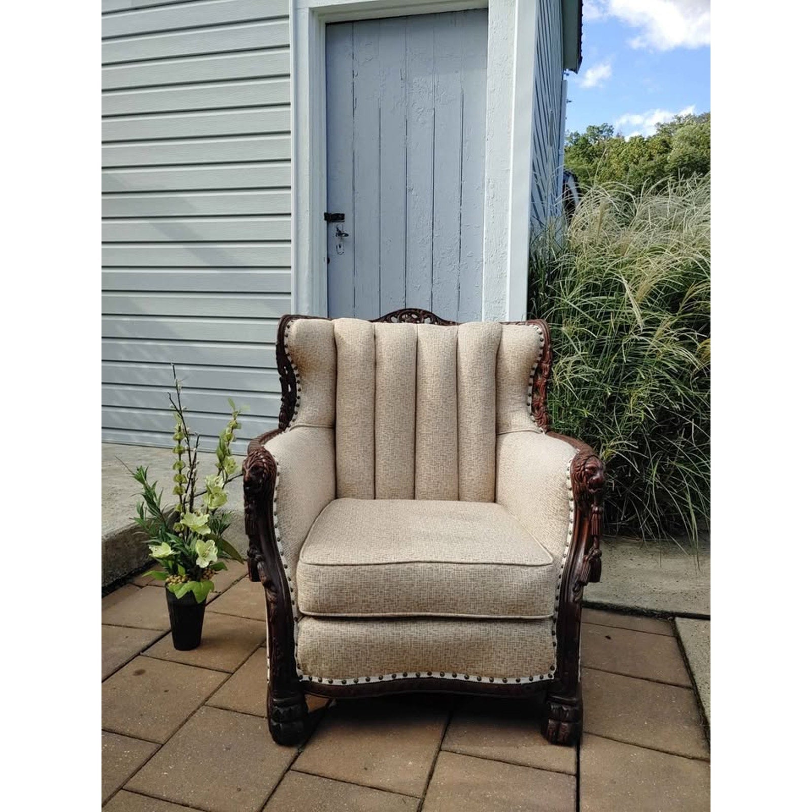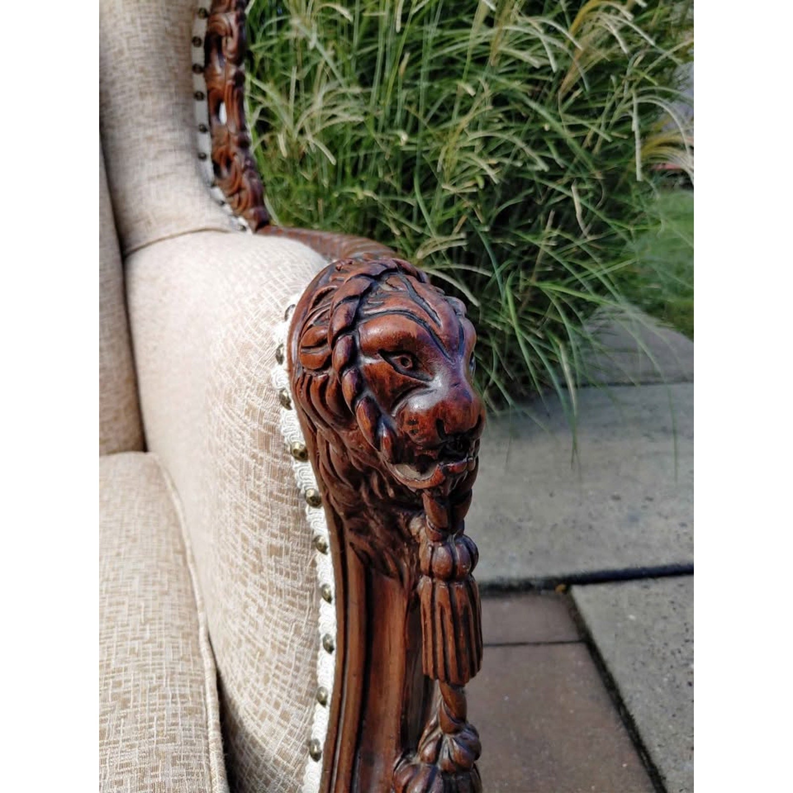 Victorian ornately carved walnut upholstered wingback library chair with carved lion head arm pommels and paw feet circa 1900 - 1910 in good condition. This item has been professionally sanitized.