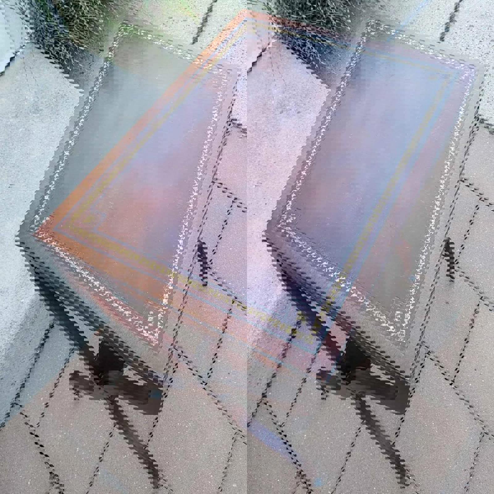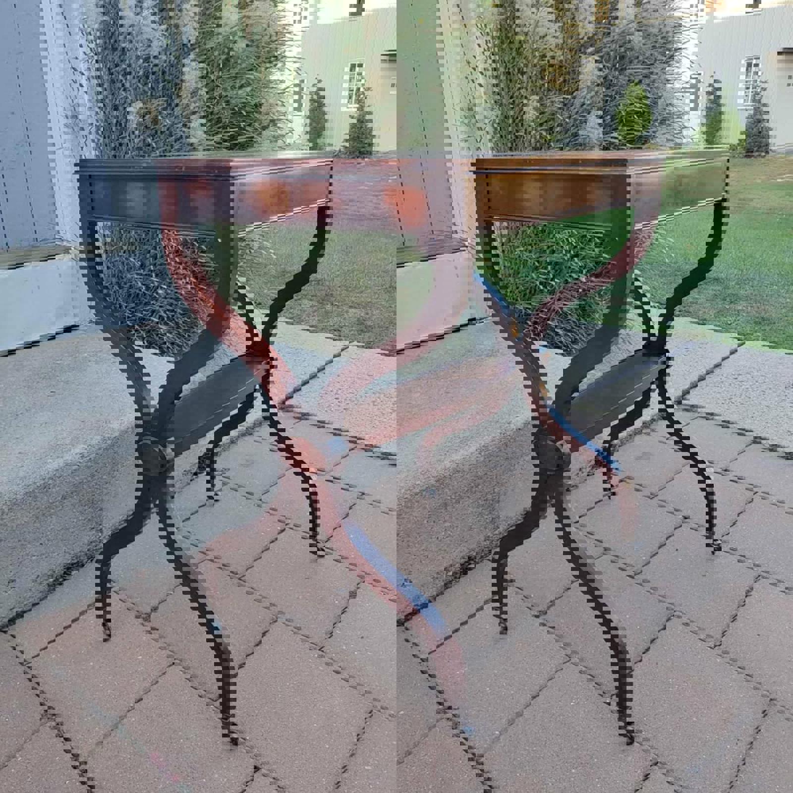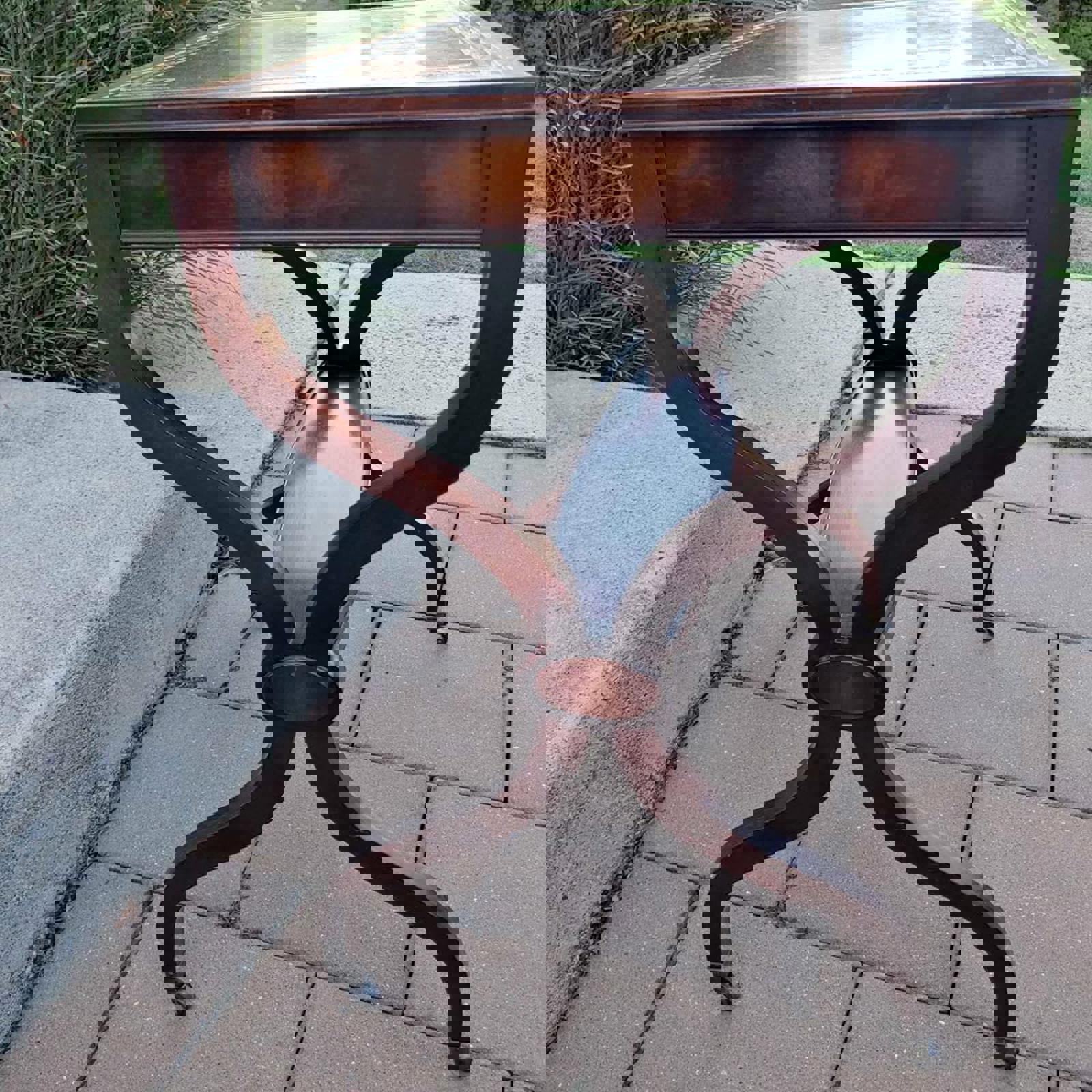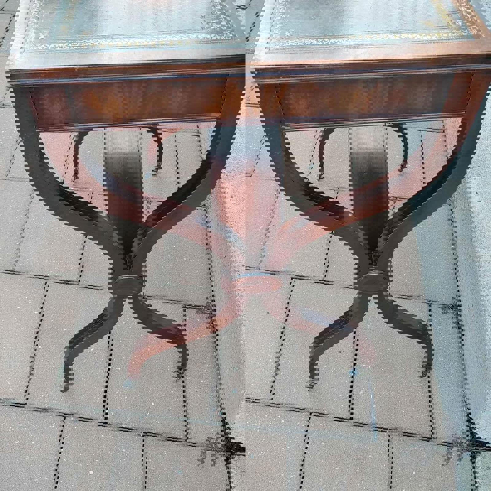 This Regency and Empire Revival Style, 1950s mahogany side table has a tooled leather top with xform or curele legs on castors and is made by Weiman Heirloom Quality Tables in Rockford, Illinois. Table is in good condition with minor wear on top.